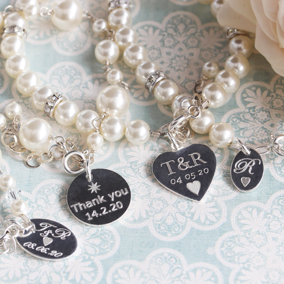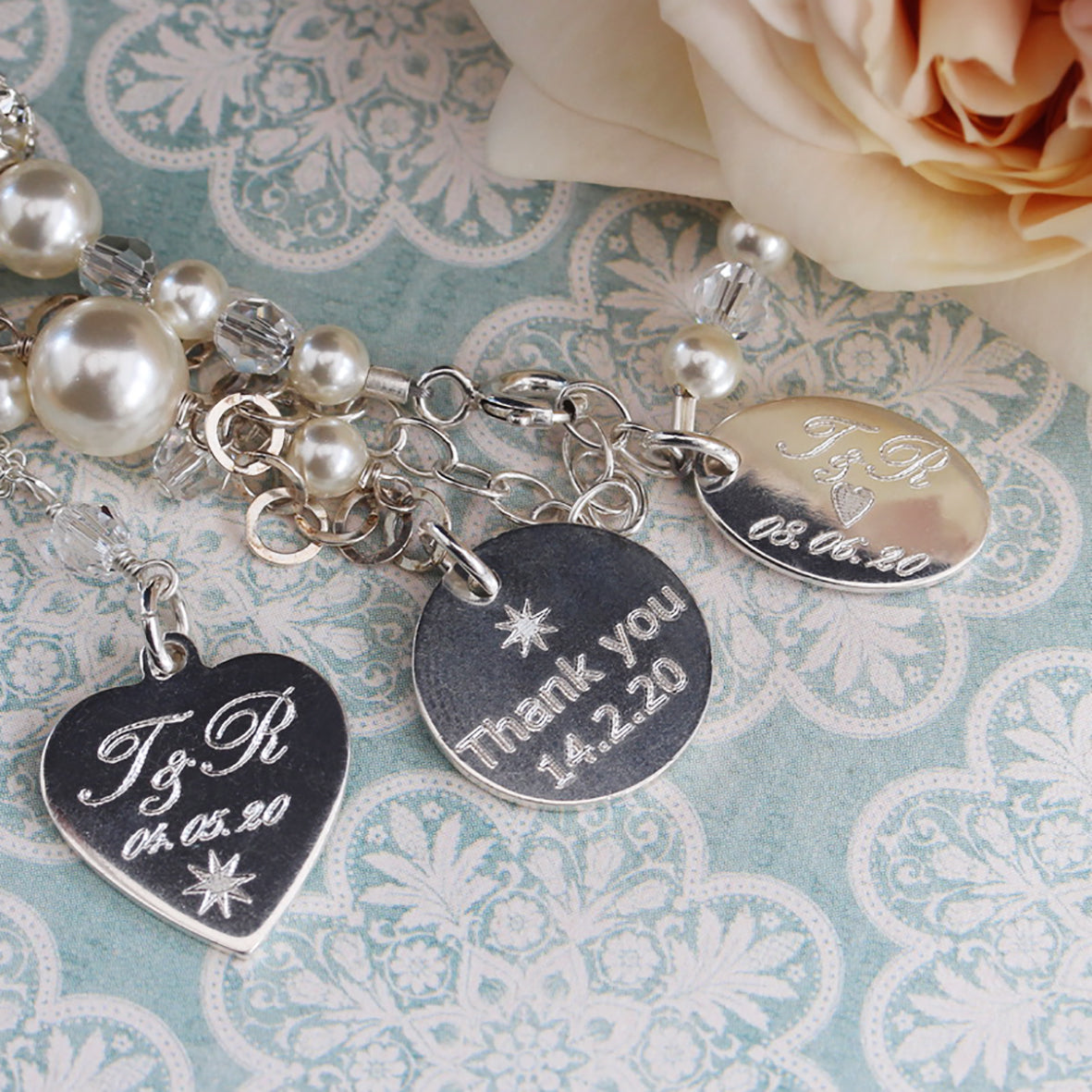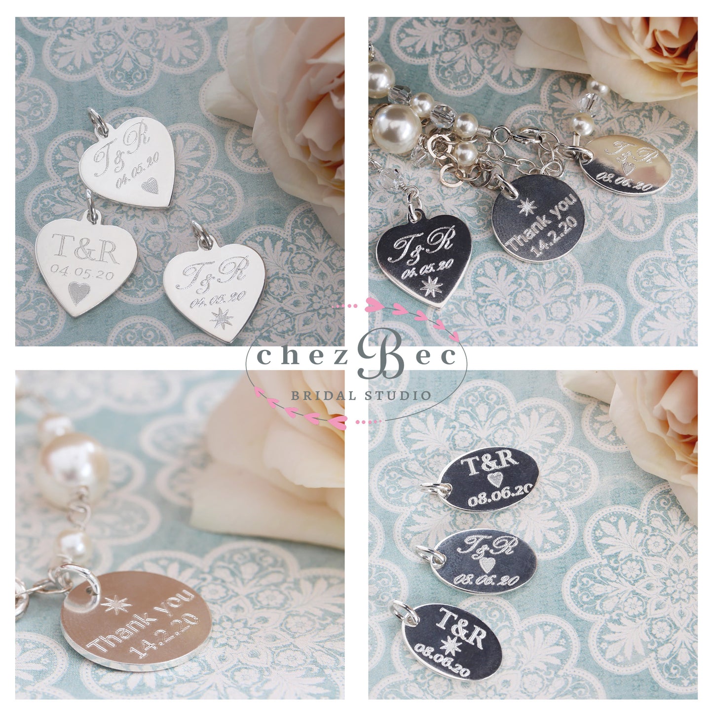 Why not add a beautiful engraved charm to personalise your bracelet. Perfect for bridesmaids gifts and to memorialise your special day.